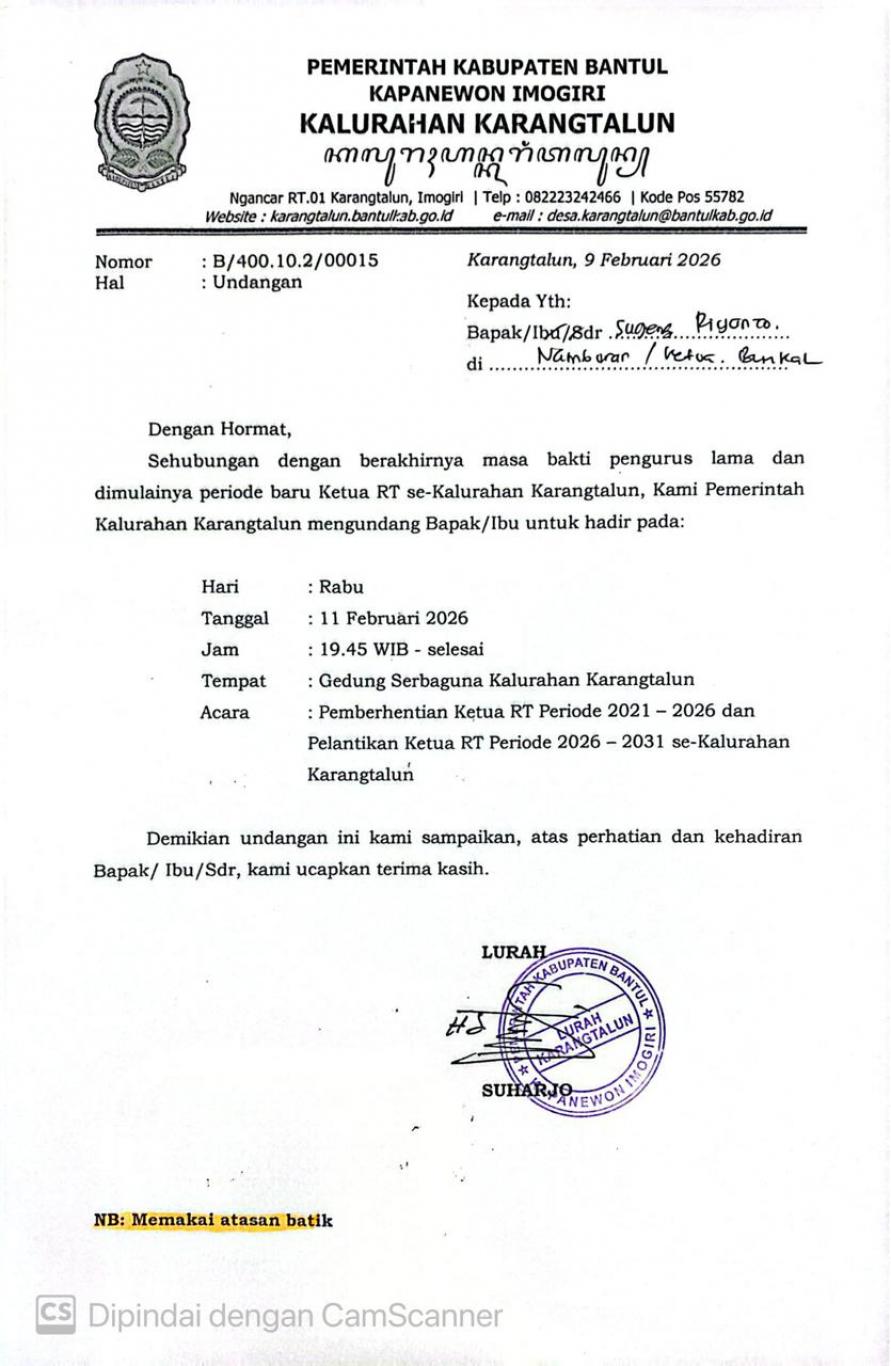 Acara : Pemberhentian Ketua RT Periode 2021 – 2026 dan Pelantikan Ketua RT Periode 2026 – 2031 se Kalurahan Karangtalun